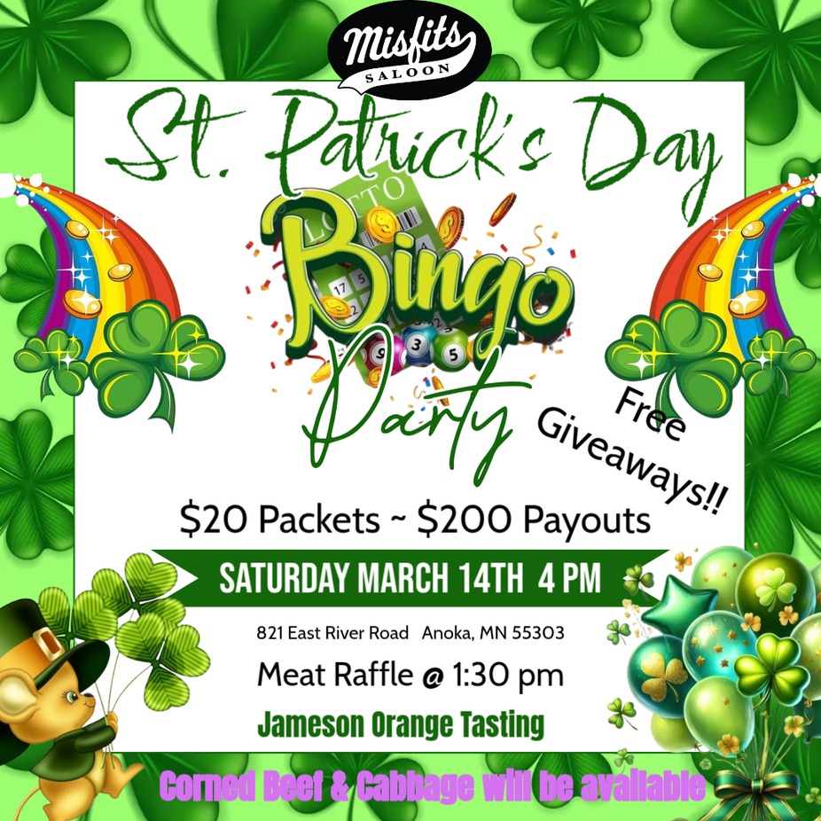Saturday Afternoon BingoGames Start at 4 pm $10 Packets ~ $99 Payouts 1st Coverall - $2 Sheet ~ 90% Payout - Minimum $99 Payout 2nd Coverall - $2 Sheet ~ $1,000 Progressive Payout ~ Starting at 52 Calls with a Max of 58 Calls - Consolation prize of $150 #BarBingo #BINGO #ComeHangoutWithUs #ComeHangout #MisfitsSaloon #SaturdayFun #GoodVibes #SaturdayAfternoonFun #AnokaMNSaturday March 7th